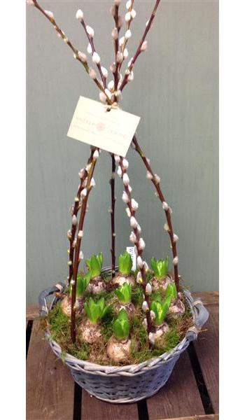 Unique design of hyacinths bulbs in a basket with the added design of a wigwam of pussy willow.