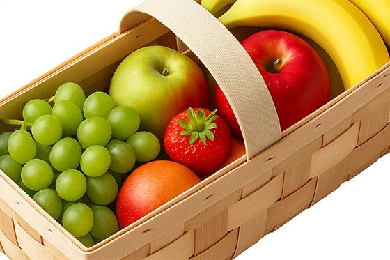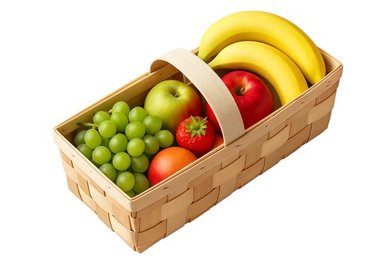 The mixed basket contains a mixture of seasonal fruits, along with the usual apples, bananas, pears, oranges and grapes.